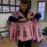 These tote bags are made from second hand materials; sewn by Gemma and screen printed by her also!